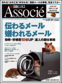 ■総力特集「一流の『ビジネス文書』術」の第2部「ライバルに4倍差がつくスピード文書術」の中のeメール編のコーナーで、「顧客の信頼が得られ、親近感も生まれる書き方とは? さりげない配慮&工夫で好感度をアップさせる」というタイトルで2ページにわたって掲載されています。